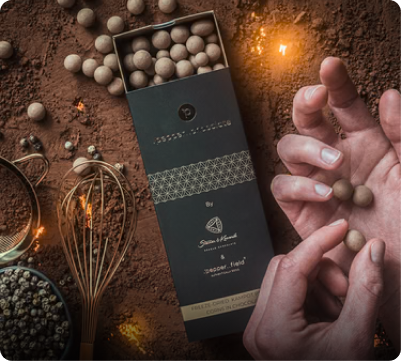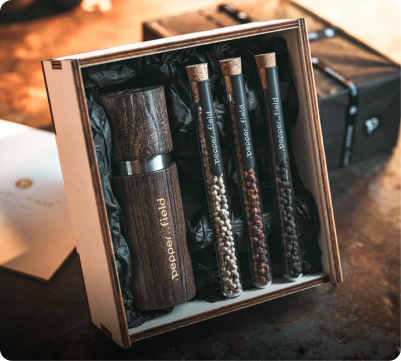 Skleněné zkumavky plníme ručně vybranými zrny Kampotského pepře a doplňujeme je o české mlýnky, dřevěné boxy i osobní vzkazy.