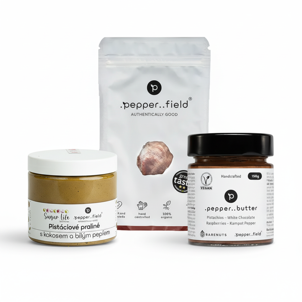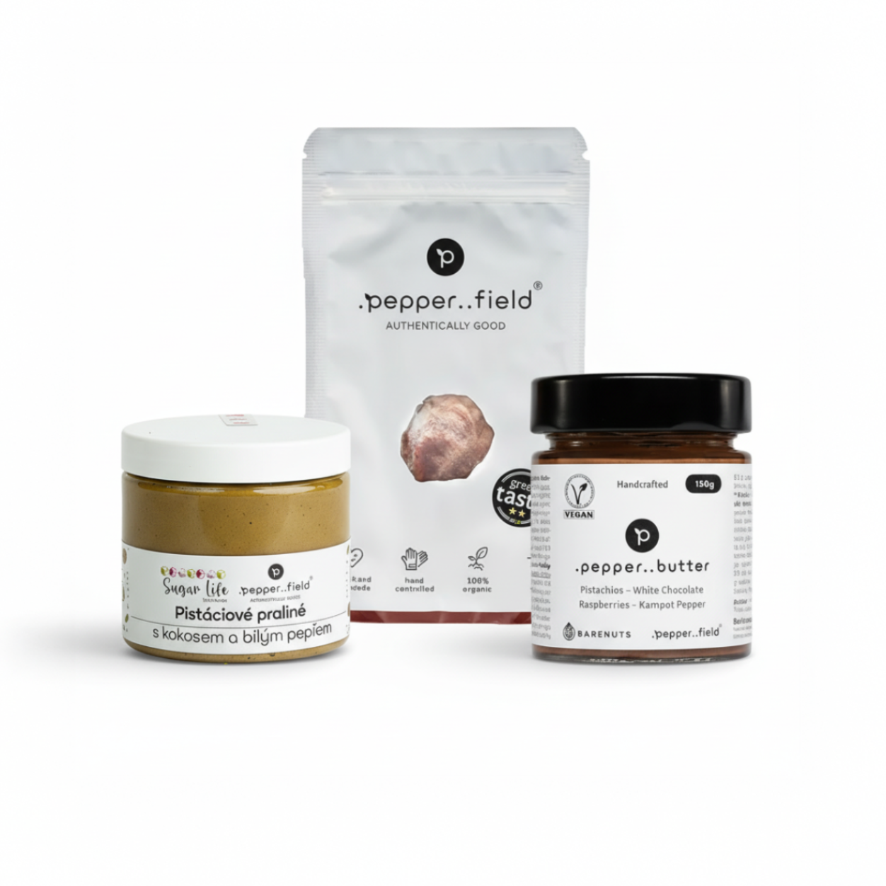 ·   Balíček obsahuje lahodné pistáciové praliné, novinku v našem sortimentu, a pistáciové máslo s bílou čokoládou, malinami a bílým Kapotským pepřem