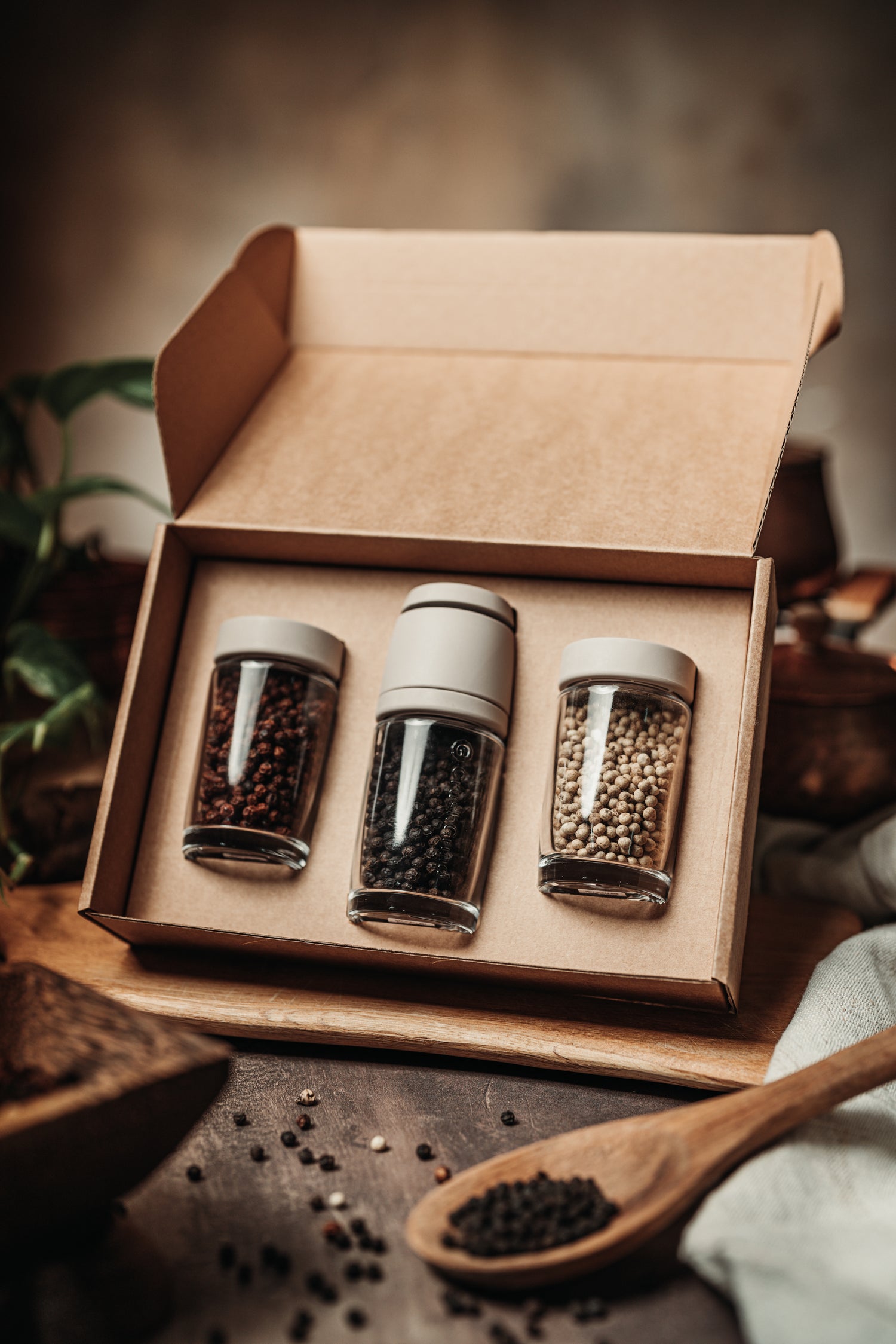 · 3x 50 g de poivre de Kampot noir, blanc et rouge