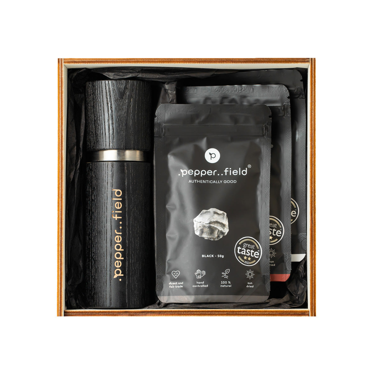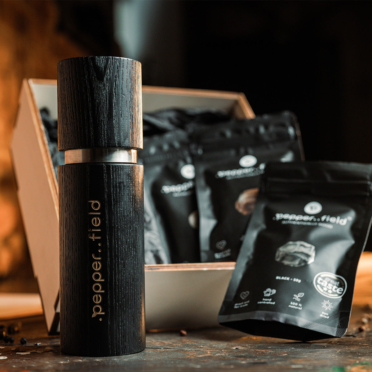 Ensemble cadeau MAXI moulin grand de 20 cm + 3x50 g de poivre de Kampot