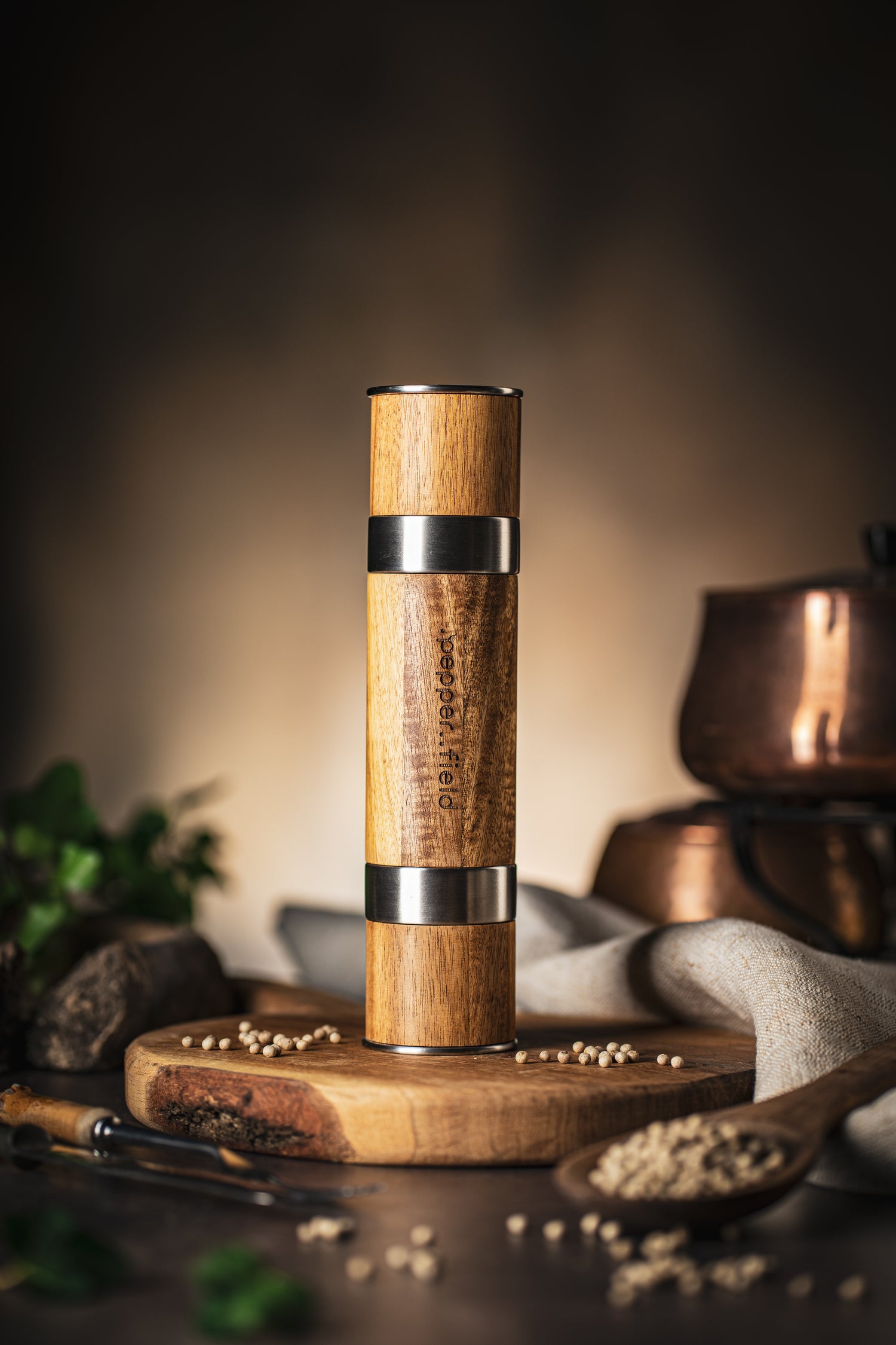 Pour la fabrication de ce moulin, nous avons utilisé du bois d'acacia avec un motif parfait, qui deviendra un ornement de chaque cuisine ou table à manger.